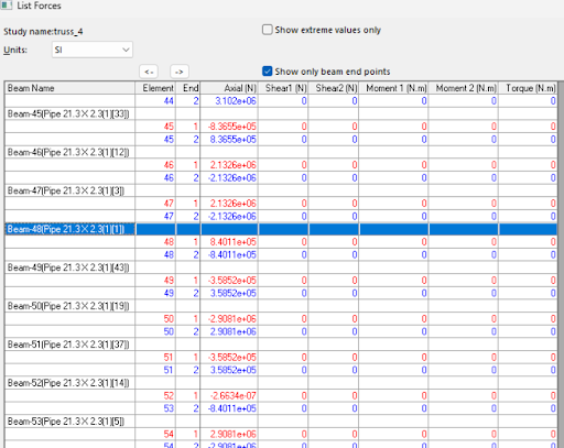 These forces were verified by written cross-sectional cut solutions, and the analysis performed was executed correct.